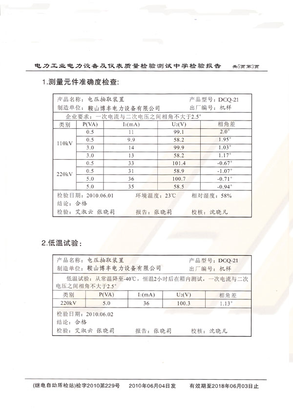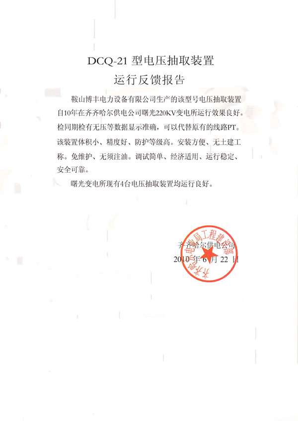國網(wǎng)黑龍江省電力公司500kvA馮屯變電站維護檢修時更換了8臺由我司生產(chǎn)的DCQ~21型電壓抽取裝置(專利產(chǎn)品)。